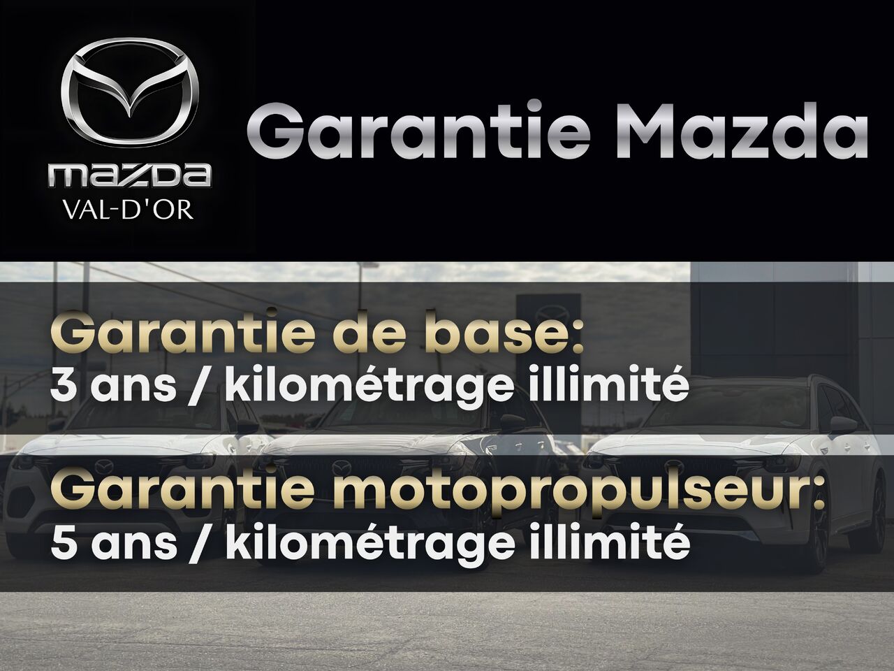 Garantie Mazda: Garantie complète : 3 ans / KM illimité Garantie Motopropulseur : 5 ans / KM illimité Assistance routière : 3 ans ou durée de la garantie complète
